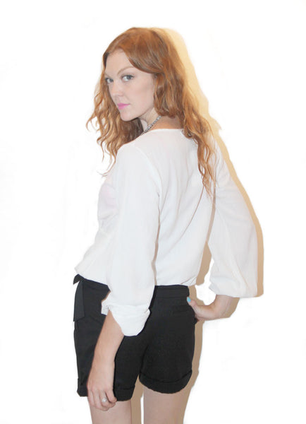 A fun take on the classic white blouse, this long-sleeved style features a deep cross-over neckline and gathered elastic at cuffs and hem, making it the ideal layering piece and a wardrobe staple. With a lace bra underneath and a sparkling necklace, the options are endless and you can dress it up or down. By For Love & Lemons.