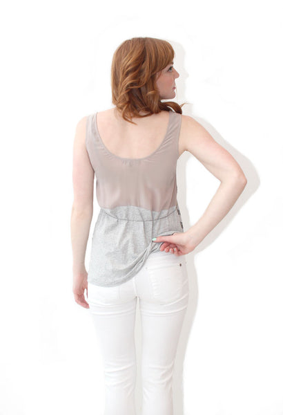 This lovely two-tone tank is pretty mix of feminine and graphic, and we love the versatility it brings to any outfit. A delicate mix of heather grey and taupe silk, with a printed zigzag pattern on the front. Pair it with crisp white denim and a clear crystal necklace for a classic look with personality. 100% silk (taupe) / 100% cotton (grey). By Funktional.