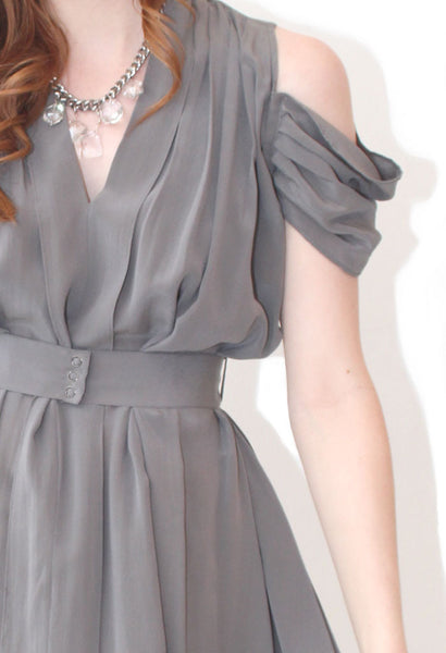 This gorgeous draped silk number is the perfect mix of sweet and edgy with the slate grey colour and pleated detailing. The sleeves drape down over the arm, leaving a cutout at the shoulder, or can be removed for a sleeveless tank style. Features snap closure waist belt, descending hem line that is longer at the sides, and a plunging v-neckline. 100% silk. By Funktional.